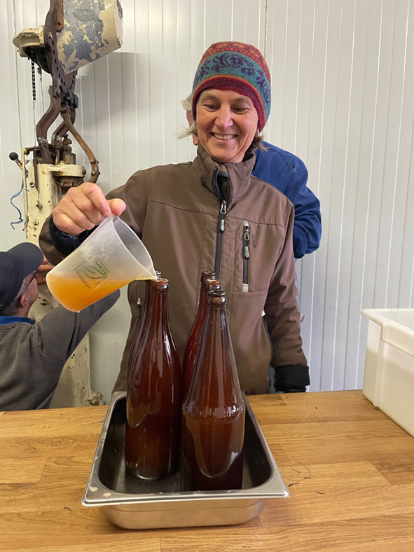 „Wir wollten unbedingt unsere schönen alten 1-Liter-Pfandflaschen zum Einsatz bringen. Zumal das einfach eine beliebte Verkaufsgröße ist. Aber es war unmöglich, eine Obstpresse zu finden, die uns sowohl diese Flaschen gewaschen, als auch unsere relativ kleine Menge an Obst gemust, gepresst, erhitzt und abgefüllt hätte. Und zudem gibt es kaum noch eine Kelterei, welche Flaschen mit Kronkorken verschließen kann.“